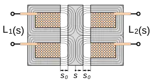 Hier ist bei der Weglänge s = 0 die Mittellage gemeint und mit s0 der Luftspalt in der Mittellage. Das bewegliche Element kann auch direkt das Messobjekt sein wenn es ferromagnetisch ist. Dann arbeitet der Sensor berührungslos.