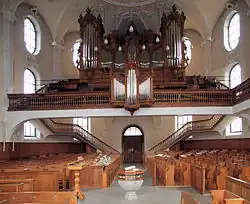 Mit der Querkirche kristallisierte sich die einzige rein protestantische Sakralbauform heraus, und zwar nicht erst im 18. Jahrhundert, wie es manche ansonsten hervorragende Fachliteratur[1][2] und sogar noch im Reformationsjahr 2017 die Deutsche Stiftung Denkmalschutz[3] meint. Sie entwickelte sich aus der spätmittelalterlichen unbestuhlten Langkirche, in süddeutschen Reichsstädten vor allem aus den Kirchen, in denen schon vor der Reformation für Predigtgottesdienste speziell Prädikanten angestellt waren,[4][5] und aus der in der Regel reichsstädtischen Predigerkirche der Dominikaner, in der die Kanzel meist seitlich an einem Mittelschiffspfeiler angebracht war. Vor dieser hatte sich die Gemeinde während der Predigt versammelt, ansonsten sich aber zum Messgottesdienst auf den geweihten Altar im Ostchor ausgerichtet. Mit der Reformation kam dieser Ort des sonntäglichen Messopfers in einem vom Kirchenschiff der Laien getrennten, dem Klerus vorbehaltenen Sakralraum, dem Chor, nicht mehr in Frage, als häufig dann freistehender Altartisch erhielt er jedoch neue Bedeutung: Tisch des Herrn, um den sich die Gemeinde zum priesterlichen Dienst aller Getauften, zum Abendmahl versammelt. Dem Gottesdienstverständnis Martin Luthers – zu Verkündigung, Gebet und Abendmahl ist jeder Ort und Raum recht –, das er in seiner Predigt zur Einweihung der Torgauer Schlosskapelle am 5. Oktober 1544 dargelegt hatte,[6][7][8][9] entsprach dann auch die Ausrichtung des Kirchengestühls und der Einbau von oft mehrseitigen Emporen mit Sitz-, Hör- und Blickrichtung vornehmlich auf die Kanzel, was der Gemeinde einen direkteren akustischen und visuellen Zugang zum Ausgangspunkt des verkündeten Evangeliums brachte. So finden sich – neben der auch traditionell im katholischen Raum verbreiteten Westempore – in protestantischen Kirchen vielfach zweiseitig gewinkelte, dreiseitig U-förmige Hufeisenemporen sowie vierseitige und auch das gesamte Kirchenschiff umziehende Rundemporen. Die Kanzel erhielt aus akustischen Gründen meist an einer Langseite des Kirchenraums ihren Platz. Mit dieser funktionalen Drehung nach Süden, Norden, teilweise sogar nach Westen, spielte die Ostung keine Rolle mehr, was auch an vielen nachreformatorischen Erweiterungen und Umbauten überkommener längsgerichteter Kirchen sowie an Kirchenschiff-Anbauten an gotische Chöre oder romanische Chortürme zu sehen ist. Bei kleinen Dorfkirchen konnte es sich nahelegen, den bisherigen Altar aus dem engen Chor in den neu gestalteten Predigtsaal zu holen, weil aus Platzgründen nur hier die Gemeinde sich zum Abendmahl versammeln konnte. So wurden alte Chorräume mitunter fast funktionslos, wenn sie sich nicht zum Einbau von besonderem Gestühl, zur Aufstellung von Epitaphien oder einer Orgel eigneten. Der protestantische Kirchenbau und seine Baumeister mussten – auch bautechnische – Lösungen für weite, möglichst stützenlose Kirchenräume finden, die die hörende Gemeinde in eher halbkreisförmige Anordnung zum „Predigtstuhl“ (die Kanzel) brachten.