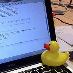 Quietscheentchen-Debugging (auch Rubberducking) ist eine Methode zum Debuggen, also um Fehler in Computerprogrammen zu finden.[1] Programierende erklären ihren Quelltext Schritt für Schritt einem Quietscheentchen; in Alltagssprache, laut oder schriftlich, und decken so Fehler oder Missverständnisse auf.