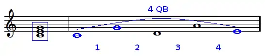 Die Töne des Akkords C-E-G befinden sich im Quintzirkel an den Stellen C-G-D-A-E. Hier beträgt die Quintenbreite 4 QB.