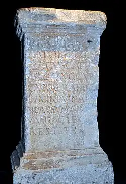 „Den Göttern, den bewahrenden, Quintus Tarquitius Catulus, Legat des Kaisers, durch dessen Sorge das Praetorium, das in Ruinen gefallen war, in neuer Gestalt ist wiederhergestellt worden.[3]“
