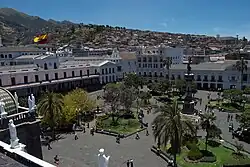 Die koloniale Altstadt reicht im Wesentlichen vom Panecillo im Süden bis zum Alameda-Park im Norden, an den sich ein Mischviertel anschließt, das bis zum El Ejido-Park reicht und an das sich wiederum nördlich das moderne Stadt- und Finanzzentrum zwischen Ejido- und Carolina-Park anschließt („Mariscal Sucre“-Viertel und Viertel nördlich der Avenida Colón). Sie hat eine Ausdehnung von etwa 8 Kilometern in Nord-Süd-Richtung und 500 bis 2000 Metern in Ost-West-Richtung.[5] Im kolonialen Zentrum befinden sich der Präsidentenpalast, die Kathedrale und die Basilika sowie die Kirchen, Konvente und Profanbauten, die den Status der Stadt als Weltkulturerbe ausmachen. Der nördliche Teil des Zentrums beherbergt das erst in den 1970er und 1980er Jahren gewachsene Finanzzentrum, aus der Altstadt verlegte Regierungsgebäude und die wichtigsten Einkaufszentren[6] sowie Wohnviertel der Mittel- und Oberklasse.