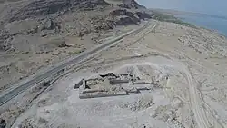 Die archäologische Stätte befindet sich etwa 20 km südöstlich von Jerusalem am Nordwestufer des Toten Meeres.[15] Sie liegt auf einem natürlichen Mergelplateau etwa 325 m unter dem Meeresspiegel, 97 m über dem heutigen Ufer des Binnensees. Dieser wird von ganzjährig Wasser führenden Zuflüssen gespeist (neben dem Jordan sind dies Wadi Mudschib und Wadi Hasa), einigen ufernahen Quellen, vor allem aber von winterlichen Niederschlägen in einem etwa 40.000 Quadratkilometer großen hydrographischen Einzugsgebiet.[16] Der Wasserstand des Toten Meeres unterliegt deshalb jahreszeitlichen Schwankungen. Er war aber auch im Lauf der Geschichte großen Schwankungen unterworfen. Das hatte Auswirkungen auf die Quellen in seiner Umgebung und damit auf die Möglichkeit einer Oasenwirtschaft mit Hainen von Dattelpalmen, zwischen denen Feldfrüchte angebaut werden konnten. Die Lage der antiken Häfen von Khirbet Mazin, Rujm el-Bahr und Kallirhoe deutet darauf hin, dass der Wasserstand in hellenistischer und frührömischer Zeit bei etwa −395 m lag. Das war eine vergleichsweise ideale Situation. Die Folge war ein Bauboom am Toten Meer seit etwa 100 v. Chr.: Villen, Gehöfte, Werkstätten, gesichert durch militärische Stützpunkte und verbunden durch ein Straßennetz. Als der Wasserspiegel in frühbyzantinischer Zeit auf über −390 m stieg, bedeckte das Tote Meer einen Teil der potentiell landwirtschaftlich nutzbaren Fläche. Sinkt der Wasserstand unter −400 m, vertrocknen einige Quellen, andere liefern nur noch brackiges Wasser. Das ist die heutige Situation.[17]