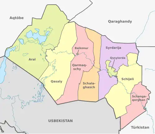 Das Gebiet ist in neun Bezirke (kasachischАуданAudan; russischРайонRajon) unterteilt. Die Städte Baikonur und Qysylorda stellt dabei jeweils einen eigenen städtischen Bezirk dar. Weitere Städte im Gebiet Qysylorda sind Aral und Qasaly.