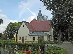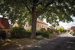 Im Jahr 1840 wurde Rähnitz zur Landgemeinde. Bereits ein Jahr zuvor wurde an der Dorfstraße (jetzt Bauernweg) das erste eigene Schulhaus des Dorfes errichtet, wodurch Rähnitz einen selbständigen Schulbezirk bildete. Zuvor gingen die Rähnitzer Kinder nach Reichenberg zur Schule, beziehungsweise wurden ab 1707 nach der Methode des Reihenzugs nacheinander in verschiedenen Bauernhäusern von Rähnitz unterrichtet. Im Jahr 1886 erbaute man ein neues Schulgebäude an der Hellerstraße 4, in dem der Schriftsteller Kurt Gerlach, unter anderem der Vater der Schriftsteller Hubert Gerlach und Tine Schulze-Gerlach[11] und über diese der Großvater von Hartmut Schulze-Gerlach, als Lehrer tätig war. Ein Jahrzehnt später wurde das Gebäude durch einen als Kindertagesstätte genutzten Anbau ergänzt, da die Bevölkerungszahl in dieser Zeit stark anstieg. Heute, im Jahr 2018, wird das gesamte Gebäude als Kindertagesstätte genutzt. Dies war auch der Grund dafür, dass der seit seinem Bestehen zur Parochie Reichenberg gehörige Ort 1899 zunächst einen eigenen Friedhof anlegen ließ, 1904 eine Kirche baute und schließlich 1913 kirchlich eigenständig wurde.[12][13] Auf dem Friedhof befindet sich ein Denkmal für die Gefallenen des Ersten Weltkriegs,[14] neben dem Friedhof auf einem Privatgrundstück die 1905 anlässlich des 100. Geburtstags Friedrich Schillers gepflanzte Schillerlinde mit Gedenkstein. In den Jahren vor 1900 entstand südlich des Ortskerns unter Gemeindevorsteher Friedrich Wilhelm Becker eine erste Kleinhaussiedlung, die in den späteren Jahrzehnten schrittweise erweitert wurde.