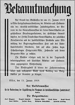 Nach dem Spartakusaufstand im Januar 1919 stieg deren Zahl in Deutschland jedoch weiter an – nun gab es Arbeiter- und Soldatenräte auch in Berlin, München, Hamburg, Bremen und dem Ruhrgebiet. Mit der Idee der Räterepublik verbunden war das Ziel der Sozialisierung der Schlüsselindustrien (Kohle, Eisen und Stahl, Banken) im Sinne von Marx und teilweise nach dem sowjetrussischen Modell. Im Frühjahr 1919 wurden nach dem Vorbild von Sowjetrussland in Bremen, Mannheim, Braunschweig, und wenige Wochen nach dem tödlichen Attentat auf Kurt Eisner 1919 in Bayern (München, Augsburg, Fürth, Rosenheim, Würzburg u. a.) offiziell Räterepubliken proklamiert. Vorangegangen war eine heftige Streikwelle vom Februar bis April 1919 in ganz Deutschland, die die Nationalversammlung mit rätedemokratischen Forderungen konfrontierte. Besonders im Ruhrgebiet, in Mitteldeutschland um Halle und Merseburg, in Oberschlesien sowie in Berlin fanden diese Aktionen breite Unterstützung in der Bevölkerung.[8] Allein in der Hauptstadt traten rund eine Million Beschäftigte in den Ausstand und forderten eine Anerkennung der Räte in der neuen Verfassung sowie weitere Maßnahmen wie eine Sozialisierung der Wirtschaft und eine demokratische Militärreform. Führende Verfechter des Rätegedankens in Deutschland waren Ernst Däumig und Richard Müller, die mit ihrer Theorie des „reinen Rätesystems“ einen erheblichen Einfluss auf die Bewegung hatten.[9]