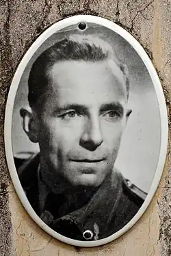 Medaillon mit dem Porträt von Michel Hollard an dem Gedenkstein auf dem Pont Charlemagne in Mijoux, Département Ain, Frankreich