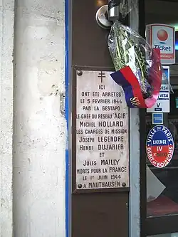 • Am ehemaligen Café des Chasseurs an der Rue du Faubourg-Saint-Denis 176 in Paris, nahe dem Gare du Nord, erinnert eine Marmortafel an die Festnahme der vier Agir Mitglieder vom 5. Februar 1944 durch die Gestapo.