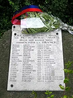 • An der Rue de Bercy 207 beim Gare de Lyon in Paris, wo in einem Zimmer des Hôtel d'Annecy die Kommandozentrale von Agir eingerichtet war, liegt eine Gedenktafel mit den Namen der 20 Personen, die im Zusammenhang mit ihren Aktivitäten für Agir ihr Leben lassen mussten.