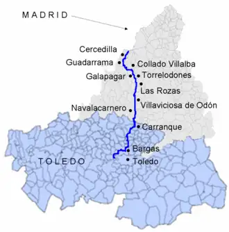 Der Río Guadarrama fließt ca. 20 km westlich an der Stadt Madrid vorbei und mündet ca. 16 km westlich von Toledo in den Tajo.