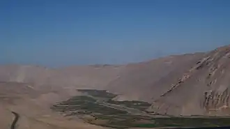 Der Río Lluta in seinem Flussbett in Küstennähe. Das fruchtbare, grüne Tal durchschneidet eine sterile, graue Wüstenlandschaft.