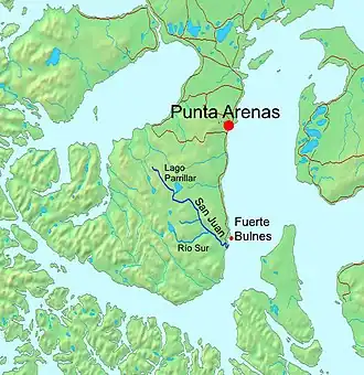 Der Río San Juan de la Posesión und sein Wassereinzugsgebiet liegen im zentralen Bereich der Brunswick-Halbinsel in der Region Magallanes in Chile, nahe zur Küstenstadt Punta Arenas. Nach der Größe seines Wassereinzugsgebietes von 860 km2 ist er der bedeutendste der dortigen Flüsse.[1] Die durchschnittlichen jährlichen Niederschlagshöhen in diesem Gebiet liegen bei 800 bis 1000 mm.[2] Er hat seinen Ursprung im Zusammenfluss von zwei namenlosen Wasserläufen die von Norden, beziehungsweise Nordwesten kommen. Von dort aus mäandert er mit einer Breite von 10 bis 20 Metern und über eine Länge von fast 60 km von Nordwesten nach Südosten durch den meist dichten Urwald bis zu seiner Mündung an der nördlichen Küste der Magellanstraße. Die Mündung liegt 55 km südlich von der Stadt Punta Arenas.