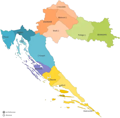Die katholische Kirche Kroatiens gliedert sich offiziell in folgende Metropolien bzw. (Erz-)Bistümer: