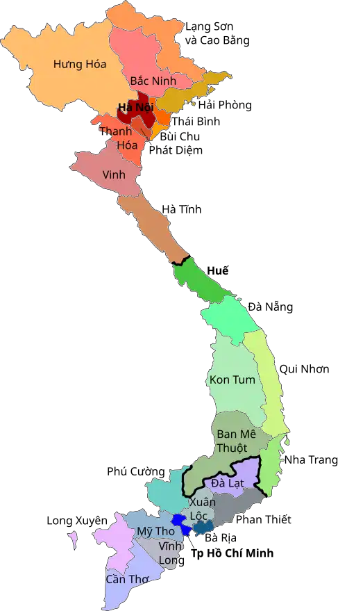 Der erste vietnamesische Bischof war Jean-Baptiste Nguyễn Bá Tòng, der 1933 zum Titularbischof geweiht wurde. Zwei Jahre später wurde er mit der Leitung des Apostolischen Vikariats Phát Diêm betraut. Erzbischof Nguyên Văn Thuân (ab 2001 Kardinal), wurde ohne Anklage und Urteil von 1975 bis 1988 in einem Umerziehungslager gefangen gehalten, davon neun Jahre in Einzelhaft.[9] In seinem Seligsprechungsprozess erkannte Papst Franziskus ihm am 4. Mai 2017 den heroischen Tugendgrad zu.[10] Paul Joseph Kardinal Phạm Đình Tụng stand als Bischof von Bắc Ninh von 1963 bis 1990 unter Hausarrest; von 1994 bis zu seinem Tod 2009 war er Erzbischof von Hanoi.[11]