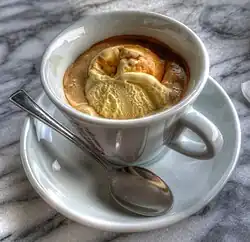 Kaffee (Standardaussprache in Deutschland: [];[1][2] in Österreich und in der Schweiz: [][1][3] ; umgangssprachlich in Norddeutschland auch [][4] ; von arabisch قهوة qahwa für „anregendes Getränk“[5][6]) ist ein je nach Röstgrad braunes bis schwarzes, psychotropes, diuretisch wirkendes,[7] coffeinhaltiges Getränk, das aus gerösteten und gemahlenen Kaffeebohnen, den Samen der Frucht der Kaffeepflanze, und heißem bzw. kaltem Wasser hergestellt wird.