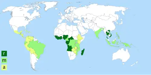 Von der Art Arabica (Coffea arabica) existierten 2005 zirka zehn Milliarden, von der Art Robusta (Coffea canephora) zirka vier Milliarden Pflanzen. Zusammen liefern diese beiden Arten 98 % des weltweit erzeugten Rohkaffees. Robusta-Kaffee stammt meist aus Westafrika, Uganda, Indonesien und Vietnam, aber auch aus Brasilien und Indien. Arabica-Kaffee wird vor allem in den Ländern Lateinamerikas, in Ostafrika, Indien und Papua-Neuguinea angebaut.[53] Laut einer Oxfam-Studie von 2002 stammen 70 % des Kaffees aus kleinbäuerlichen Betrieben.[54]