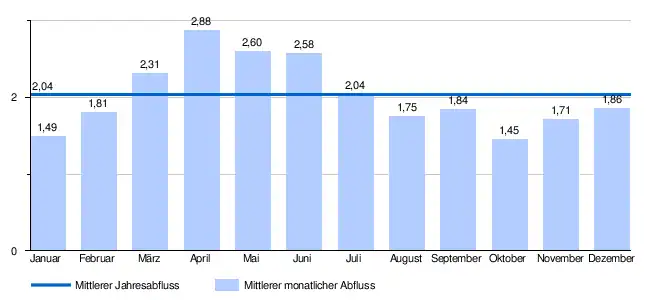 Der modellierte monatliche mittlere Abfluss (MQ) des Rümligs in m³/s[10]