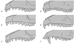 Obere Zahnreihe der sechs Gattungen der Rüsselspringer im Vergleich: A: Elephantulus, B: Petrosaltator, C: Galegeeska, D: Macroscelides, E: Petrodromus, F: Rhynchocyon