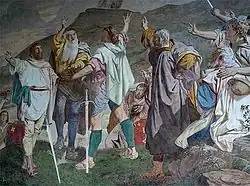Bildliche Darstellungen der drei Eidgenossen sind seit dem 16. Jahrhundert belegt und seit dem 17. Jahrhundert gelegentlich mit erhobener Schwurhand dargestellt. Diese ikonographische Tradition wurde im 19. Jahrhundert konventionell, und oft wurde seitdem auch der Schwur selbst auf das Rütli verlegt. Der Begriff «Rütlischwur» entstand um 1850 zusammen mit dieser eigentlich verkürzenden ikonographischen Konvention. Laut Befreiungstradition war das Rütli der nächtliche Treffpunkt der bereits Verschworenen und nicht Ort des Schwurs selbst.[1]