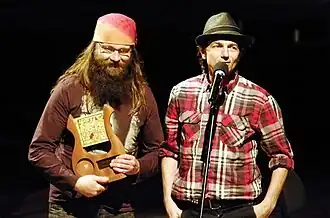 ![]() Kamil Rogiński und Paweł Gumola, Mitglieder des Projektes R.U.T.A. bei Auszeichnung mit dem „Wirtualne Gęśle“-Preis für das beste Folkalbum des Jahres 2011 | |