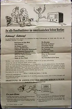 Seit 1947 konnte über Rundfunkanlagen auf Mittelwelle gesendet werden. Ab 1953 lag die Sende- und Programmaufsicht bei der US Information Agency (US Information Service), die dem US-Außenministerium unterstand. Die Mitarbeiter hatten US-amerikanische Arbeitsverträge und wurden von den USA bezahlt.[4] Das Gebäude des RIAS befand sich nun in der Kufsteiner Straße 69 in Berlin-Schöneberg.