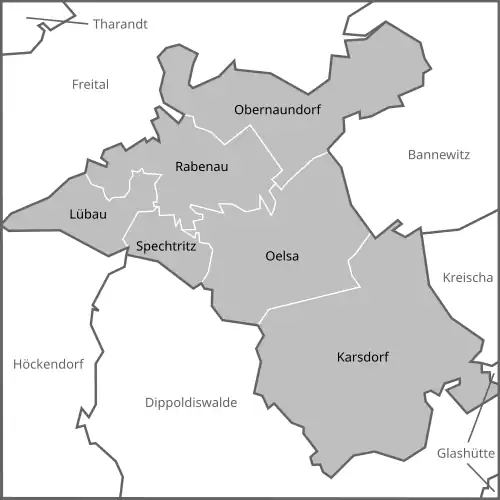 1952 wurde die Stadt dem neugebildeten Kreis Freital zugeordnet. 1971 wurde Karsdorf Ortsteil von Oelsa. 1973[13] wurde Spechtritz Ortsteil von Rabenau (vorher zu Seifersdorf gepfarrt), 1974 auch Lübau und Obernaundorf.