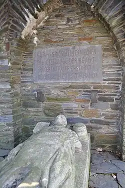 Das gotisierende Ehrenmal wurde aus Schiefer und Lavastein erbaut. Im wie eine Grabkammer wirkenden Innenraum befindet sich die Figur eines gefallenen Soldaten des Bildhauers Carl Stock. Das Ehrenmal hat einen quadratischen Grundriss, die Wände werden durch Spitzbogen unterbrochen.[3]