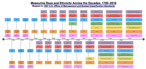 Bis 1960 wurden Menschen von Regierungsangestellten einer „Rasse“ zugeordnet, ab 1970 wurde in Stichproben nach einem „mexikanischen“, „puerto-ricanischen“, „kubanischen“, „zentral- oder südamerikanischen“ oder „anderem spanischen“ Hintergrund gefragt; ab 1980 wurde allen Befragten diese Frage gestellt.[7] „Im Jahr 2007 hat die Equal Employment Opportunity Commission des US-Arbeitsministeriums in seinem Bereich die Einteilungen von Rasse und Ethnie an die aktuellen Definitionen des OMB angepasst.“[8]