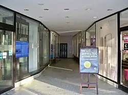Die Ladenzeile an der Porschestraße besteht aus zwei Geschossen, die durch einen trichterförmigen Eingang vertikal halbiert werden. Im Erdgeschoss befinden sich große Fensterflächen. Die ebenso großflächigen Fenster des Obergeschosses kragen aus und werden von schmalen Fensterprofilen und Stahlstützen gehalten. Den oberen Abschluss bildet ein erneut auskragendes Flachdach. Der Haupteingangsbereich ist mit großen Vitrinen und einem Mosaikboden ausgestattet.[1]