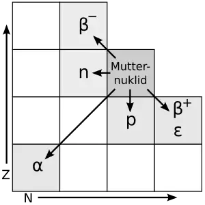 - zu viele Protonen: Beta-Plus-Zerfall oder Elektroneneinfang; bei großem Überschuss auch direkte Protonenemission