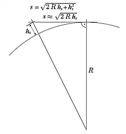 Mit denselben Formeln wird auch der Radarhorizont berechnet.[7] Im Gegensatz zu einem Überhorizontradar basiert die Funktionsweise einer Radaranlage auf einer quasioptischen Ausbreitung der Radiowellen. Dabei ist der Radio-/Radarhorizont der Radaranlage maßgebend. Dessen Reichweite wird danach berechnet, aus welcher Entfernung ein Zielecho noch erfasst werden kann, dessen Signal von einer vorgegebenen Rückstrahlfäche reflektiert wurde (siehe Radarquerschnitt). Dann entspricht der Radiohorizont des Zieles dem der Radaranlage und ist deshalb für die Berechnung ihrer Reichweite nicht relevant. Im Gegensatz zu oben genannter Berechnung zweier Antennen findet hier also keine Addition statt.