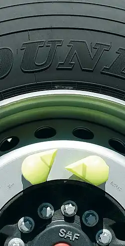 Radmutterindikatoren dienen der Sicherung der Räder von Fahrzeugen, vornehmlich Lastkraftwagen (LKW), um Unfälle durch Lösen der Radmuttern zu verhindern. Sie sind einfach und ohne Werkzeug zu montieren. Jeder Fahrer eines LKW muss sich vor Fahrtantritt vom sicheren Zustand der Räder und der Bereifung vergewissern; dies verlangen Berufsgenossenschaften in ihren Unfallverhütungsvorschriften.[1][2] Zeitdruck und Unwissenheit führen aber häufig dazu, dass diese Prüfungen nicht durchgeführt werden. Fast ein Drittel aller Fahrer kontrolliert nach den Ergebnissen einer in Großbritannien erstellten Studie[3] die Radmuttern vor Fahrtantritt nicht. In einem Newsletter des deutschen Bundesverbandes für den Reifenhandel (BRV) von 2012 heißt es zur Relevanz des Sicherheitsaspektes: „Die Vorteile (...) liegen auf der Hand: Für den Fuhrparkleiter bedeuten sie eine erhebliche Erleichterung und Verkürzung der Kontrollrundgänge sowie eine Verbesserung der Wartung und Sicherheit der Flotte. Insgesamt erhöhen sie für alle Verkehrsteilnehmer, ob Fahrer, Fußgänger oder Flottenbesitzer, die Sicherheit auf den Straßen deutlich.“[4] Radmutterindikatoren sind in zahlreichen Varianten und Schlüsselweiten erhältlich. Sowohl Fahrer als auch Kontrollbehörden wie die Polizei können auf einen Blick erkennen, ob die Radmuttern gesichert sind.