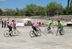 Radpolo ist eine Radsportart, die Elemente von Radball und dem von Reitern auf Pferden gespielten Polo kombiniert. Die Teams von je mindestens zwei Radfahrern versuchen, den Ball mit einem Schläger an einem langen Stiel ins gegnerische Tor zu treiben.