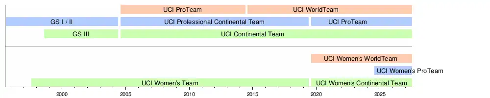 Die Teams im internationalen Radsport der Männer wurden 1996 in zwei Kategorien eingeteilt, 1999 kam eine dritte hinzu. Diese hießen auf Französisch Groupes sportifs (GS) bzw. auf Englisch Trade Teams (TT), jeweils um die römischen Zahlen Ⅰ, Ⅱ und Ⅲ ergänzt.[12] Die Rennen selbst wurden in einen Weltkalender und einen kontinentalen Kalender mit mehreren Unterklassen eingeteilt. Dabei blieben die höchstrangigen Wettkämpfe wie Weltcup oder große Landesrundfahrten den GS Ⅰ und Ⅱ vorbehalten. Diese unterlagen denselben Statuten und wurden direkt von der UCI kontrolliert, unter anderem war ein Mindestgehalt für Fahrer vorgeschrieben. Die Gruppe der GS Ⅰ bestand aus 22 Teams, die jedes Jahr nach den Leistungen der vorangegangenen Saison bestimmt wurden, und hatte garantierten Zugang zum Weltcup, während die übrigen Teams auf Einladungen angewiesen waren. Die GS Ⅲ wurden durch die nationalen Verbände kontrolliert und hatten geringere Auflagen zu erfüllen, insbesondere gab es keine Vorschriften über die Bezahlung der Fahrer; sie konnten aber nur an niederrangigen Rennen teilnehmen.[13] Ab 2002 wurde die Zahl der GS Ⅰ auf 30 erhöht, wobei die besten 10 Top Club genannt wurden und erweiterte Teilnahmerechte bzw. -pflichten hatten.[14]