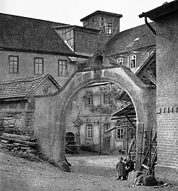 Die zweigeschossige mit Rustika und einem Mansarddach versehene Mühle war ein Bau im Stil des Rokoko aus dem Jahr 1774 und wurde am 11. April 1945 durch Artilleriebeschuss zerstört. Die Fassade des Baus war durch fünf Fenster in entsprechende Achsen gegliedert. Im Erdgeschoss waren sowohl auf der linken als auch an der rechten Seite zwei weite Stichbogen vorgeblendet worden. Im rechten vorgeblendeten Stichbogen befand sich die Haustür, wobei über der Haustür ein Löwe mit Wappenschild zu sehen war. In diesem Wappenschild war ursprünglich ein Mühlrad zu sehen. Im linken vorgeblendeten Stichbogen war ein Fenster, wobei über dem Fenster ein Löwe mit Wappenschild mit der Jahreszahl 1774 zu sehen war. Die noch erhaltenen Rokokokartuschen mit heraldischen Löwen, dem Mühlradsymbol und den Initialen F. R. (Friedrich Rahmer) stehen unter Denkmalschutz und befinden sich am Giebel der neuen, im Jahre 1949 erbauten Mühle.