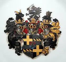 Das Wappen der Raitz von Frentz wurde jeweils anlässlich der Erhebung zweier Linien in den Reichsfreiherrenstand vermehrt.