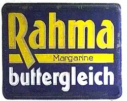 Zu Beginn der 1920er Jahre wurde Margarine in Deutschland regional produziert und beworben. So auch bei der Deutschen Jurgenswerke AG. Die Deutsche Jurgenswerke AG beschloss 1924, diese Vielfalt der eigenen Marken durch eine gemeinsame Marke, Rahma, zu ersetzen.[6] Der Name des Pflanzenfettes Rahma sollte Assoziationen mit dem tierischen Rahm erwecken;[6] auch mit Attributen wie „butterfein“ u. ä. wurde Ra(h)ma beworben, bis allerdings eine deutsche Rechtsverordnung Ende 1932 solchen Anlehnungsversuchen ein Ende setzte, indem sie in der Etikettierung und Werbung von Margarine jegliche Hinweise auf Milch, Butter und andere Milcherzeugnisse in Wort und Bild untersagte.[7][8] Bereits 1926 wurde das „h“ aus dem Markennamen genommen, um eine Verwechslung mit reinen Milchprodukten auszuschließen.[9]