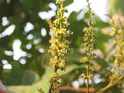Nephelium lappaceum ist einhäusig monözisch oder zweihäusig diözisch. Die Pflanze blüht und trägt zweimal jährlich; die 2,5 bis 5 mm kleinen, süß duftenden Blüten stehen in aufrechten achsel- sowie endständigen, 30 Zentimeter langen Rispen. Die eingeschlechtlichen, funktionell männlichen oder weiblichen, kurz gestielten Blüten mit meist einfacher Blütenhülle, sind weiß bis gelb-grün. Es ist meist nur ein kleiner, innen und außen mehr oder weniger behaarter Kelch mit 4–6 Zipfeln vorhanden, die Petalen fehlen meist oder sind stark reduziert.