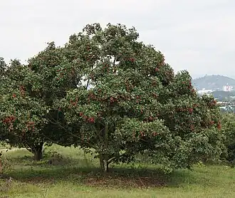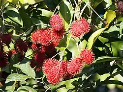 Der Rambutan (Nephelium lappaceum) ist eine Pflanzenart innerhalb der Familie der Seifenbaumgewächse (Sapindaceae). Diese tropische Pflanzenart ist mit dem Litschibaum (Litchi chinensis) verwandt. Der Trivialname Rambutan leitet sich vom malaiischen Wort rambut ab, das „Haar“ bedeutet und verweist auf die dicht mit weichen Stacheln besetzte Frucht. Daher wird die Frucht auch behaarte oder falsche Litschi genannt. Im Malaiischen Archipel ist der Rambutan einer der häufigsten Obstbäume.[1]