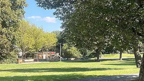 An der Nordseite des Parks, nahe der Grünen Gasse, befindet sich ein Kinderspielplatz mit Wippe, Kletterkombination, Schaukel, Rutsche und einer Tischtennisplatte sowie Sitzbänken.
