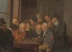 Schachspieler im Café de la Régence, links (wahrscheinlich) der berühmteste Schachspieler seiner Zeit, Philidor, von dem im Dialog auch die Rede ist.
