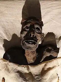 Der Mumie des Königs widerfuhr eine wahre Odyssee. Bereits in der 21. Dynastie (unter Smendes I./Pinudjem I.) wurde sie zusammen mit der seines Enkels Ramses II. in das Grab des Sethos I. (KV17) gebracht, wohl als Schutz vor Grabräubern. Unter Siamun (21. Dynastie) erfolgte eine weitere Umbettung in die berühmte Cachette von Deir el-Bahari (DB/TT320). Nach der Entdeckung der Cachette verkaufte Abd el-Rassul die Mumie an einen Amerikaner. 1870 tauchte sie im Niagara Falls Museum auf und blieb dort bis 1999, dem Verkauf an das Michael C. Carlos Museum in Atlanta/USA. Nach langen Verhandlungen wurde sie 2003 dem Ägyptischen Museum Kairo zurückgegeben.[9] Zahi Hawass identifizierte sie als Mumie des Ramses I., hauptsächlich auf Grund der Ähnlichkeit mit der des Sethos I. Zweifel über ihre Identität sind angebracht, solange keine DNA-Analyse durchgeführt wurde. Am 9. März 2004 fand sie ihre (vorläufig) letzte Ruhestätte im Luxor-Museum, zusammen mit der des Ahmose, dem Begründer der 18. Dynastie.[10]
