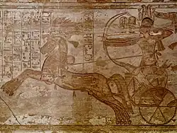 Jan Assmann unterschied 1991 zwischen einem „identitären“ und einem „konzeptionellen“ Konzept der Göttlichkeit des Pharao.[25] Demzufolge besitzt der Pharao eine persönliche göttliche Identität als Sohn des Gottes Re (im Alten Reich) beziehungsweise Amun (im Neuen Reich). In Gestalt eines Menschen, des amtierenden Pharaos, zeugt der Gott mit einer menschlichen Gemahlin einen göttlichen Sohn. Dennoch bleibt der Pharao ein sterblicher Mensch, der sich wie jeder andere vor dem Totengericht zu verantworten hat. Über die Regierungsdauer eines einzelnen Pharaos hinaus kommt der Institution des Königtums eine unabhängige Göttlichkeit zu. Diese garantiert die unveränderlich bleibende Weltordnung, welche in der Göttin Maat personifiziert ist.[26] Der langen Lebensdauer und regen Bautätigkeit Ramses II. ist zu verdanken, dass sich viele Bauten, Abbildungen und Schrifttexte erhalten haben, auf denen und mit Hilfe derer sich der Pharao in diese Traditionen stellt. In der Bauinschrift im Totentempel des Sethos in Abydos legitimiert sich Ramses als Sohn des in seinem Vater Sethos personifizierten Gottes Amun. Darüber hinaus berichtet der Text, dass Ramses im Jahr 1 seiner Regierung anlässlich des Opet-Festes durch Amun-Re in seinem Herrschaftsanspruch bestätigt wurde.[19] Im weiteren Verlauf festigte Ramses seine Herrschaft durch die geschickte Auswahl fähiger und loyaler Priester und Beamter. So ernannte er im ersten Regierungsjahr Nebwenennef zum Hohenpriester des Amun und behielt den einflussreichen Paser im Amt, der schon Wesir seines Vaters gewesen war. Zahlreiche Abbildungen und Reliefs zeigen den Pharao in der Bildtradition des „Einigers der beiden Länder“, siegreich auf dem Streitwagen sowie beim „Erschlagen der Feinde“ als Beschützer Ägyptens.