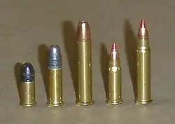 Durch den Rand optisch ähnlich: Randpatrone .357 Magnum mit Zentralfeuerzündung (links) und eine .22 lfB mit Randfeuerzündung (rechts) -