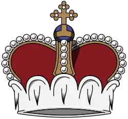 Erlauchtkrone | Einige mediatisierte Grafen- und kleinere Fürstenhäuser, die das Anrecht auf die Anrede Erlaucht hatten, führten eine Krone, aus der sich eine purpurne Mütze ohne Bügel erhob, die bei dem Familienoberhaupt oben mit einem Reichsapfel, bei den Nachgeborenen mit einem Hermelinschwänzchen besetzt war. |