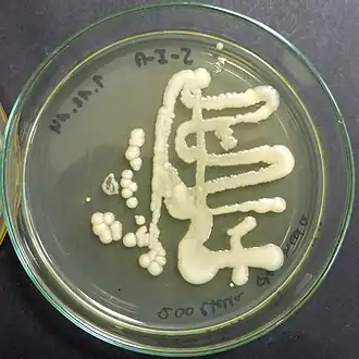 Der GC-Gehalt, also der Anteil der Nukleinbasen Guanin und Cytosin in der Bakterien-DNA, liegt bei 55–58 Molprozent.[3]