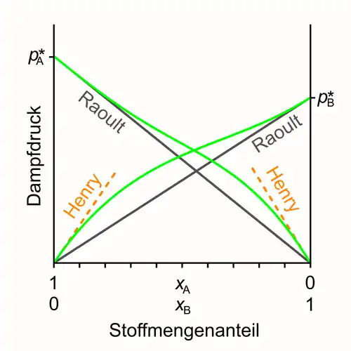 Geht der Stoffmengenanteil einer Substanz gegen Null, nähert sich die reale Kurve ebenso wie die ideale Kurve dem Partialdruck Null. Statt an die ideale Raoultsche Kurve schmiegt sie sich jedoch tangential an eine Gerade mit einer im Allgemeinen anderen Steigung an.[5] Diese Gerade beschreibt das Henry-Gesetz, gemäß welchem der Partialdruck ebenfalls proportional zum Stoffmengenanteil ist, aber mit einer anderen Proportionalitätskonstanten. Eine mit kleinem Stoffmengenanteil vorhandene Substanz gehorcht also näherungsweise dem Henry-Gesetz: