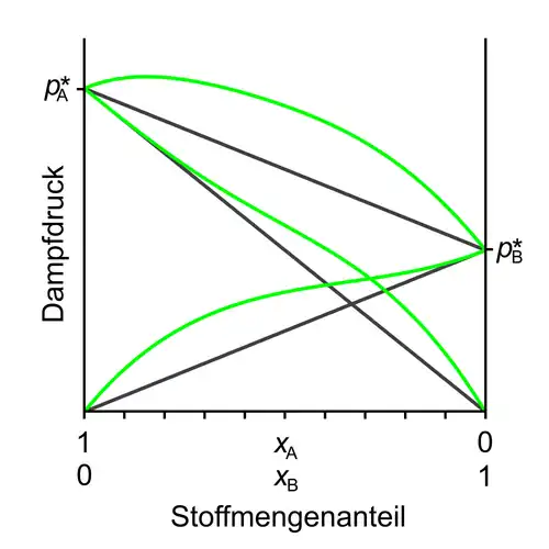 und sind die Gleichgewichtsdampfdrücke von beziehungsweise bei der gegebenen Temperatur, wenn sie als Reinstoffe vorliegen. Da Stoffmengenanteile stets kleiner oder gleich Eins sind, haben die gemischten Stoffe in der Mischung kleinere Partialdrücke als wenn sie in reiner Form vorliegen.