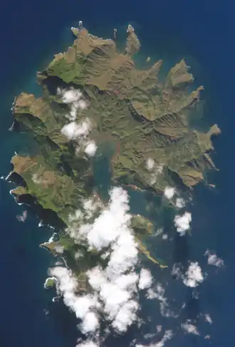 „Wo die steilen Kanten der zerklüfteten Gipfel die Küste erreichen, bilden sie große Klippen, die senkrecht zum Meer fallen. Die Küste ist schroff mit tiefen Brandungshöhlen. Außer über die Buchten ist die Insel unzugänglich.“