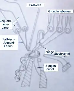 Maschinen sind mit Zungen- oder Schiebernadeln bestückt. Zur Grundausstattung gehören: